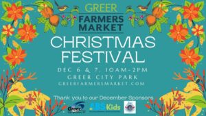 Our annual 2-Day festival is BACK, Dec 6 & 7, 10AM-2PM in Greer City Park. Get in the holiday spirit and complete your shopping with us and 60+ farmers, maker, and bakers. Your friends and family will be delighted with their high quality, locally handmade items. We have plenty of goods to bring to your holiday parties such as cookies, coffee, dips, and more.