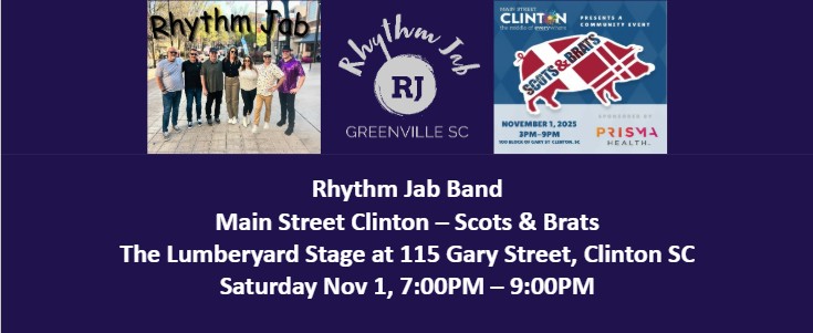 Rhythm Jab Band - Main Street Clinton - Scots & Brats Festival 7:00PM - 9:00PM on The Lumberyard Stage 115 Gary Street, Clinton SC |