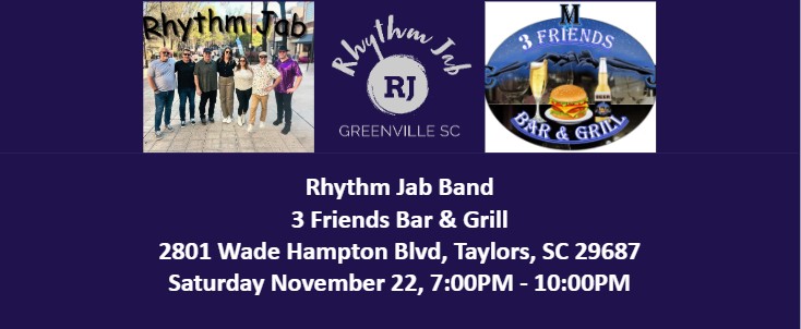 Rhythm Jab Band - 3 Friends Bar & Grill Taylors, Saturday November 22, 7:00PM - 10:00PM! |